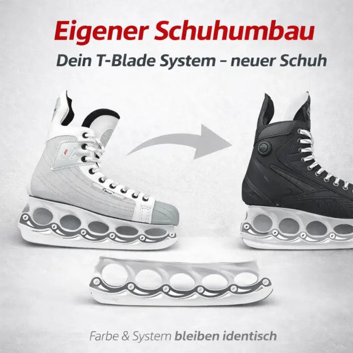 Der eigene Schuhumbau ist die wirtschaftlichste, nachhaltigste und technisch sauberste Lösung, um dein bewährtes T-Blade System weiterzufahren – auf einem neuen Schlittschuh, exakt montiert und einsatzbereit.