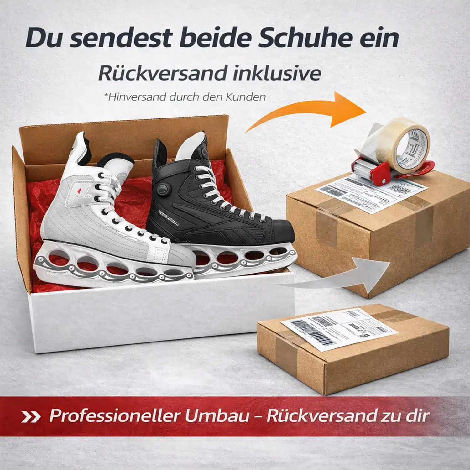 2. Du schickst uns deinen alten und deinen neuen Schlittschuh auf eigene Kosten zu
